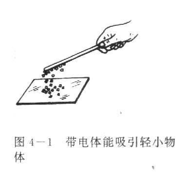 实验:用绸子、毛皮或尼龙布料在玻璃棒、橡胶律或塑料棒上摩擦几下,然后把棒靠近纸屑、头发、羽毛等轻个物体(图4-1),会看到什么现象?