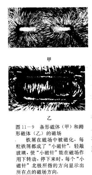 实验结果如图11-9所示,在磁场中无数被磁化了的铁屑排成一条条曲线,形象地显示出各点的磁场方向。